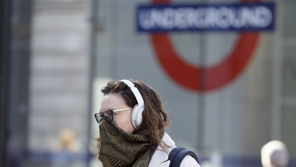 A commuter covers her face in London, Monday, March 16, 2020. /AP
