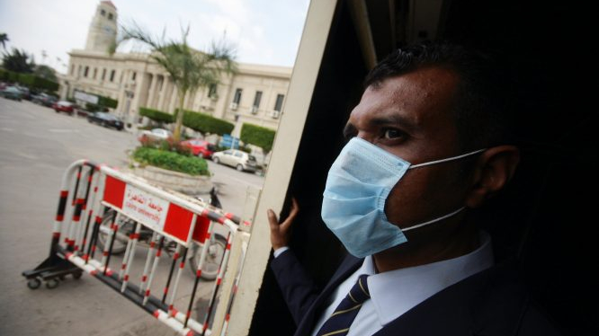 A security guard at Cairo University wears a protective mask following the suspension of study for only undergraduate students amid coronavirus disease (COVID-19) spread, in Cairo, Egypt March 15, 2020./REUTERS.