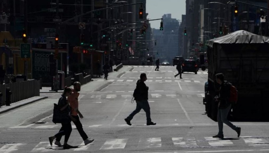 People cross a deserted 7th Ave in Times Square during the epidemic outbreak, in the Manhattan borough of New York City, New York, U.S., March 26, 2020. /Reuters