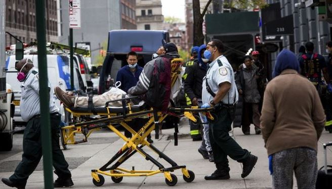 First responders wheel a man on a stretcher in the Brooklyn borough of New York, the United States, on May 8, 2020. (Photo by Michael Nagle/Xinhua)