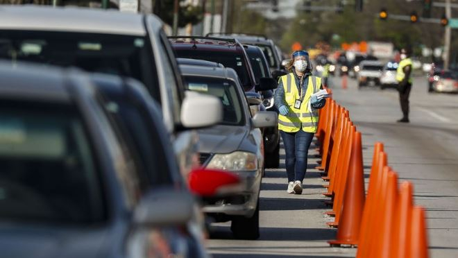 A healthcare worker hands out testing information to people waiting at a drive-through COVID-19 testing site on Northwest Side of Chicago, the United States, on May 6, 2020. (Photo by Joel Lerner/Xinhua)