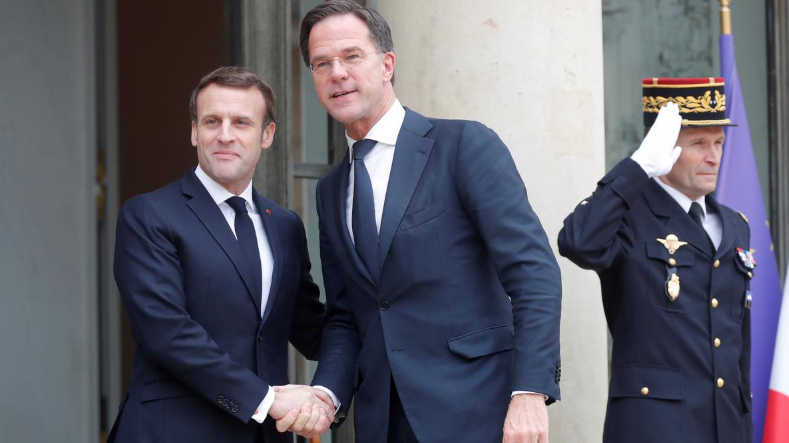 FILE PHOTO: French President Emmanuel Macron welcomes Dutch Prime Minister Mark Rutte for a working lunch at the Elysee Palace in Paris, France, February 14, 2020. /Reuters