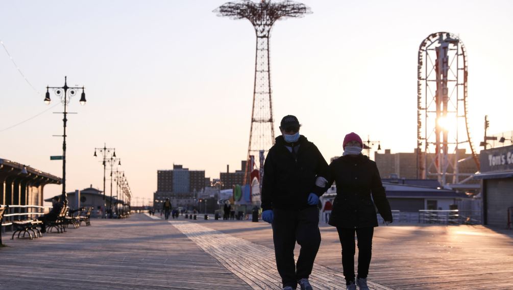 People wearing protective masks walk past closed shops on the Coney Island boardwalk during the COVID-19 outbreak in Brooklyn, New York, U.S., April 11, 2020. /Reuters