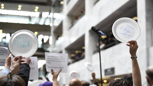 Union members, federal workers and other demonstrators protest the partial government shutdown on day 33 of the shutdown in the Hart Senate Office Building in Washington D.C., the United States, on Jan. 23, 2019. /Xinhua