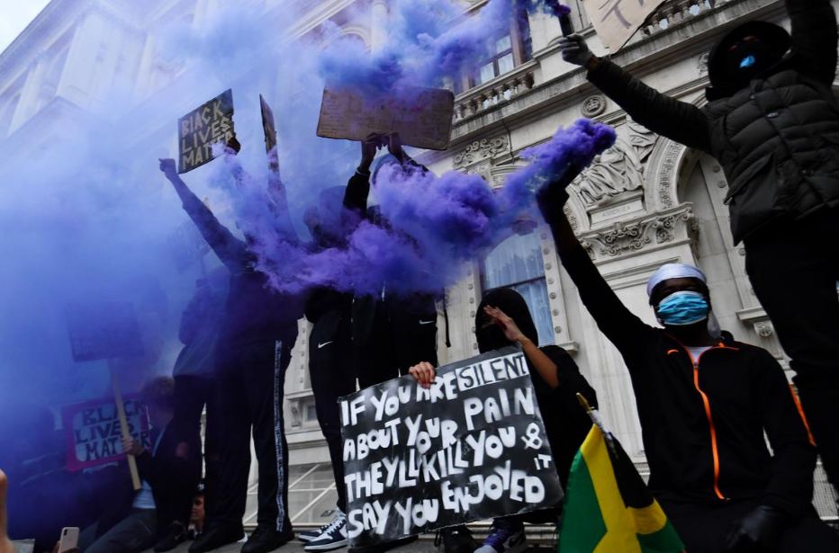 Demonstrators hold up signs and flares in Parliament Square during a Black Lives Matter protest in London following the death of George Floyd in police custody in Minneapolis, U.S., June 7, 2020. /Reuters