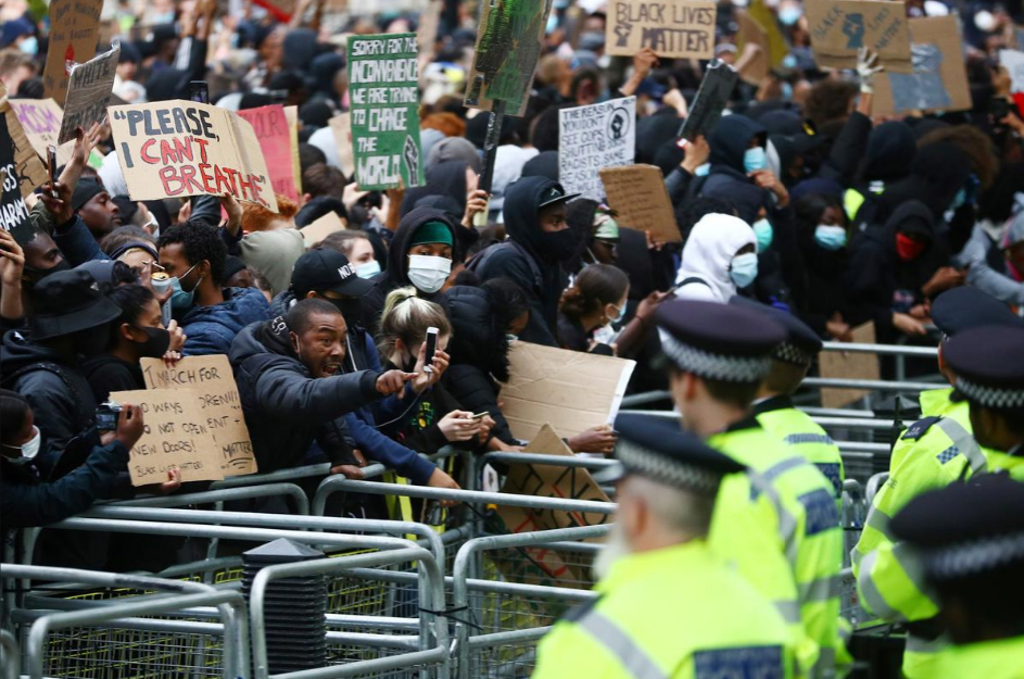 Authorities had urged protesters not to gather in London again on Sunday, warning they risked spreading COVID-19, the respiratory disease caused by the novel coronavirus. But demonstrators still packed the road outside the U.S. Embassy on the south bank of the River Thames.