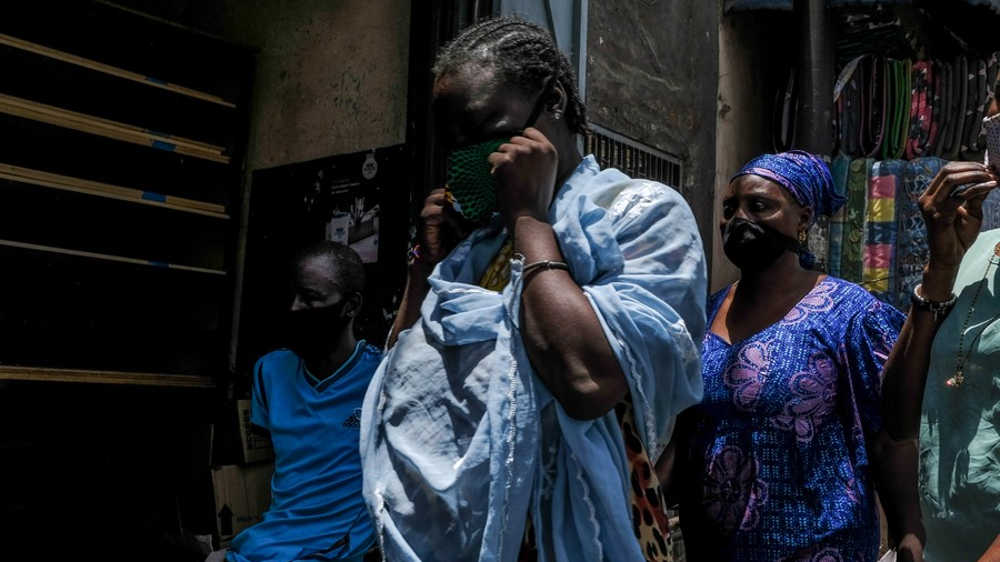A woman adjusts her mask in a market in Dakar, Senegal, May 23, 2020. /Xinhua