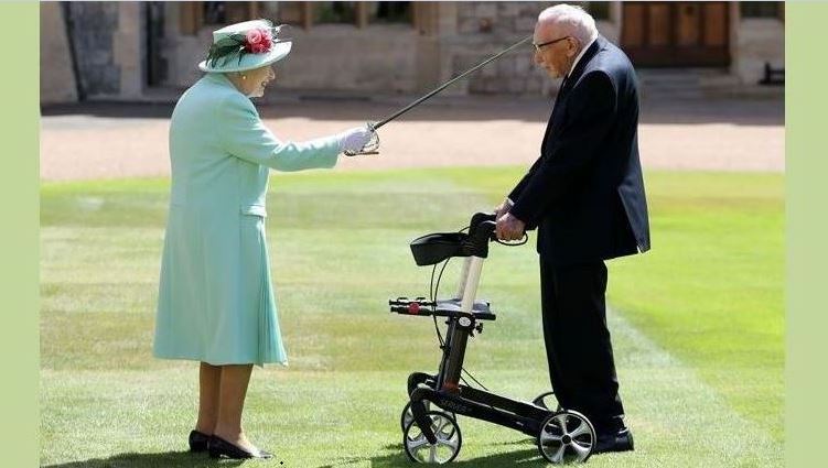 Queen Elizabeth II awards Captain Tom Moore with the insignia of Knight Bachelor at Windsor Castle, in Windsor, U.K. July 17, 2020. Chris Jackson/Pool via REUTERS