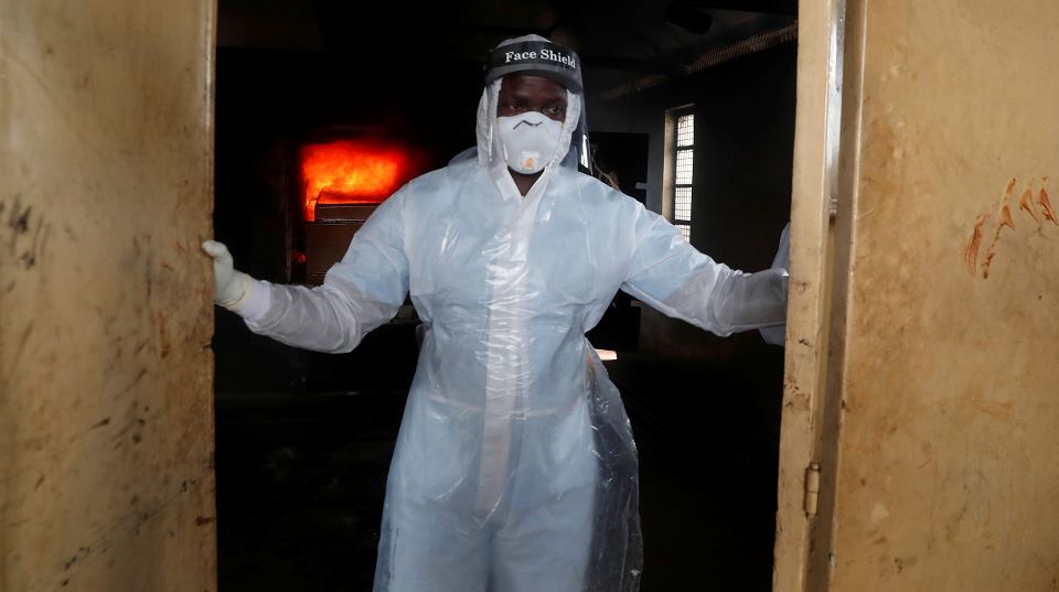 A health worker closes the chamber during the cremation of the body of a patient who died due to COVID-19, at a crematorium in Nairobi, Kenya July 20, 2020. REUTERS/Thomas Mukoya