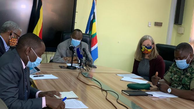 Uganda's Director-General of Health Services Dr. Henry Mwebesa (centre) addresses the press. /Ministry of Health Uganda