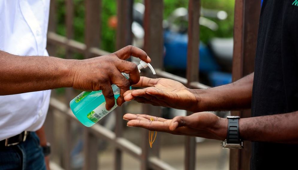 FILE PHOTO: A security guard pours hand sanitising gel into a shopper's hands as he enters the Tejuoso shopping complex at the Yaba market, amid the COVID-19 outbreak, in Lagos, Nigeria March 23, 2020. REUTERS/Temilade Adelaja/File Photo