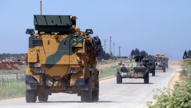 Military vehicles are seen during a joint patrol of Turkish and Russian troops in northwestern Idlib province of Syria, on May 28, 2020. (Xinhua)