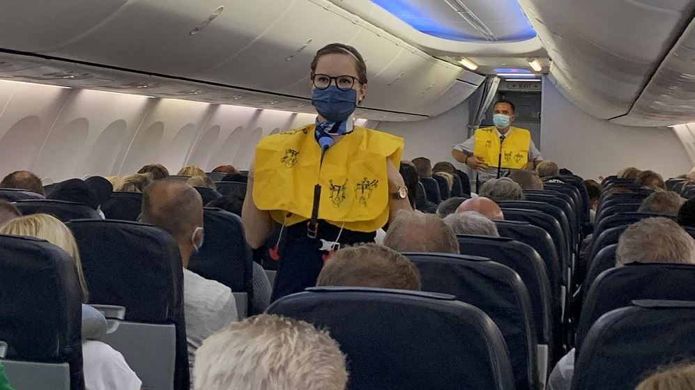 FILE PHOTO: Flight attendants of TUI Fly wear face masks as they give instructions to German tourists on the first flight from Duesseldorf to Mallorca, two weeks before Spain starts reopening borders closed since mid-March to curb the COVID-19 pandemic, in Duesseldorf, Germany, June 15, 2020. REUTERS/Erol Dogrudogan/File Photo
