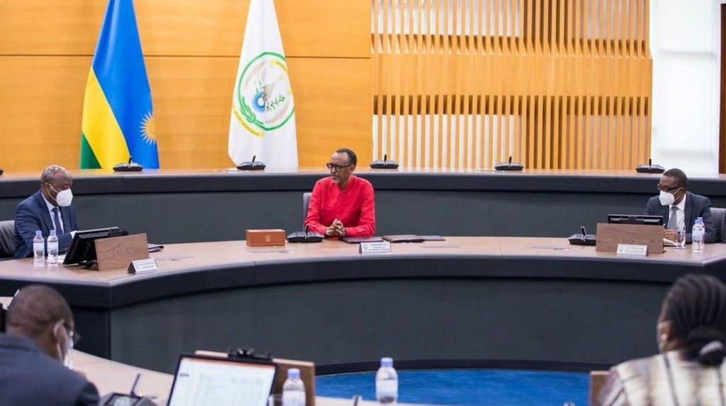 FILE PHOTO: President Paul Kagame (Center – in red) chairs a Cabinet meeting at Urugwiro Village to evaluate measures in place to stop the spread of COVID-19 in Rwanda, 3 June 2020. /Photo courtesy: Rwanda Presidency – Twitter.