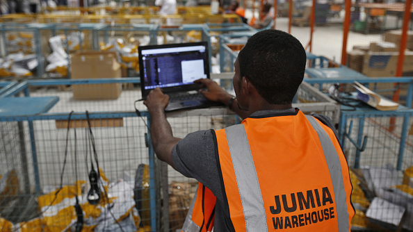 A worker uses a laptop computer inside a Jumia Technologies AG distribution warehouse in Lagos, Nigeria. /George Osodi/Bloomberg
