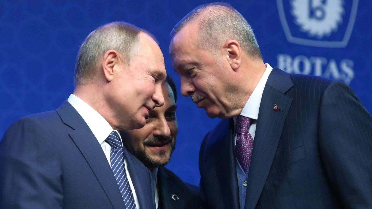 FILE PHOTO: Turkish President Recep Tayyip Erdogan (R) and Russian President Vladimir Putin (L) talk after they symbolically open a valve during a ceremony in Istanbul for the inauguration of the TurkStream pipeline, January 8, 2020. /AP Photo