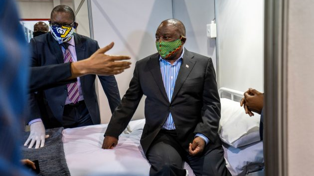 FILE PHOTO: South African President Cyril Ramaphosa visits the COVID-19 treatment facilities at the NASREC Expo Centre in Johannesburg, South Africa. Jerome Delay/Pool via REUTERS/File Photo