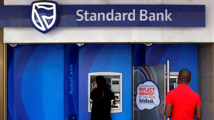 FILE PHOTO: Customers queue to draw money from an ATM outside a branch of South Africa's Standard Bank in Cape Town. /Reuters