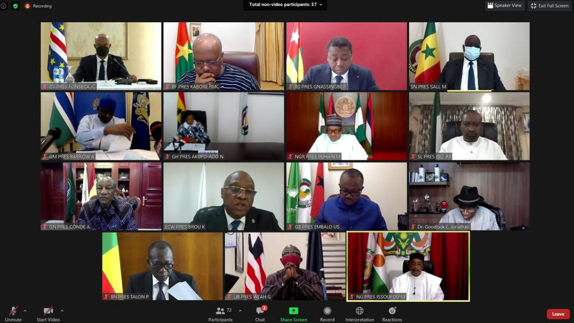 A screenshot shows a teleconference during the extraordinary Summit of the Economic Community of West African States (ECOWAS) Authority of Heads of State and Government on the Socio-Political Situation in Mali August 20, 2020. /Reuters
