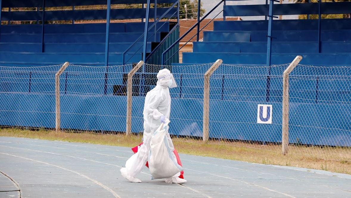 FILE PHOTO: A health worker dressed in a protective suit carries bags of bio hazard materials from a field hospital built on a soccer stadium in Machakos, Kenya, July 23, 2020. /Reuters
