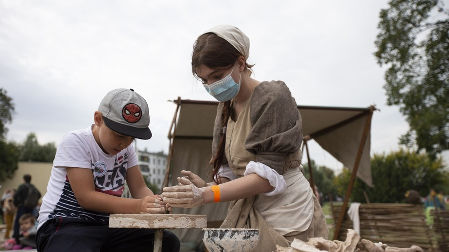 A staff member wearing a face mask and traditional costumes makes pottery with a young visitor during a Moscow City Day cultural event at Kolomenskoye park in Moscow, Russia, Sept. 5, 2020. /Xinhua