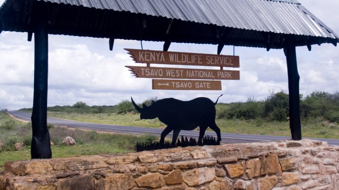 Rhinoceros sign for Tsavo Gate Tsavo West National Park Kenya. /Getty Images
