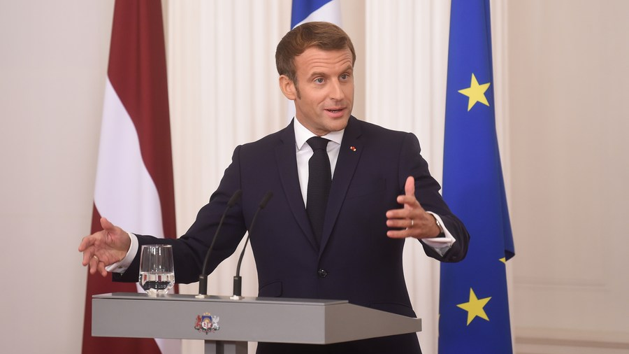 French President Emmanuel Macron attends a press conference at Riga Palace in Riga, Latvia, Sept. 29, 2020. /Xinhua