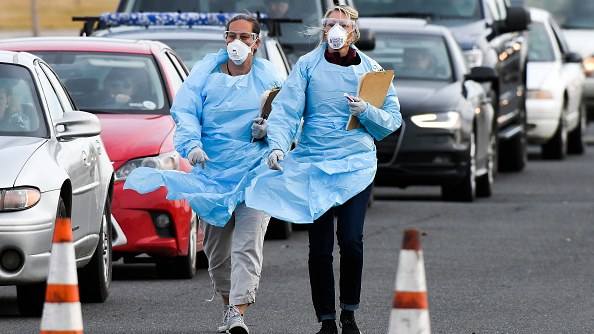 FILE PHOTO: Healthcare workers from the Colorado Department of Public Health and Environment check in with people waiting to be tested for COVID-19 at the state's first drive-up testing center. (Photo by Michael Ciaglo/Getty Images)
