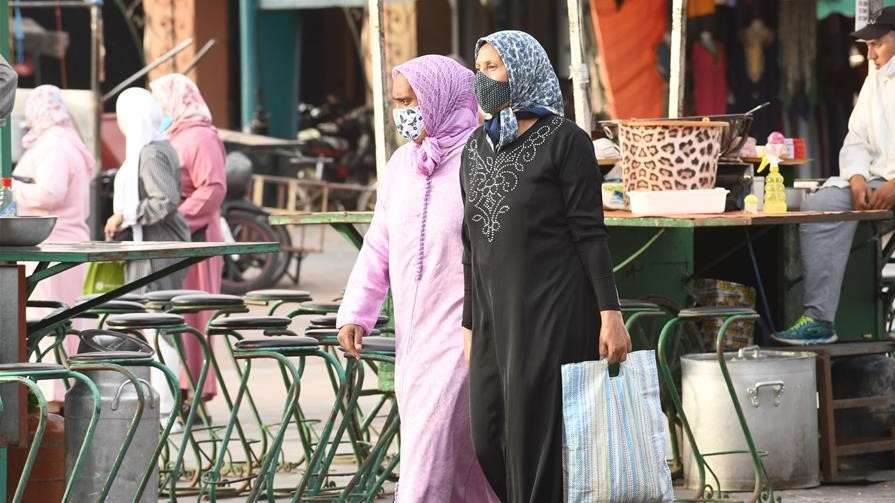 People wearing face masks are seen in a square in Marrakech, Morocco, on Oct. 7, 2020. /Xinhua