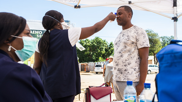 FILE PHOTO: A medical worker checks the temperature of a local resident during a regional health screening program in Rustenburg, South Africa. /Getty Images