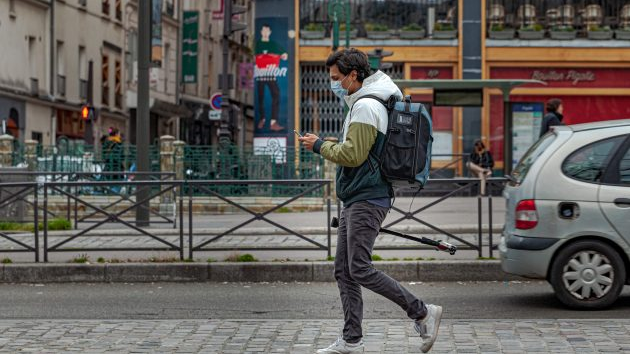 2020, March 16 – Paris, France : Man wearing a mask marking social distancing in the street of Paris during the coronavirus pandemic