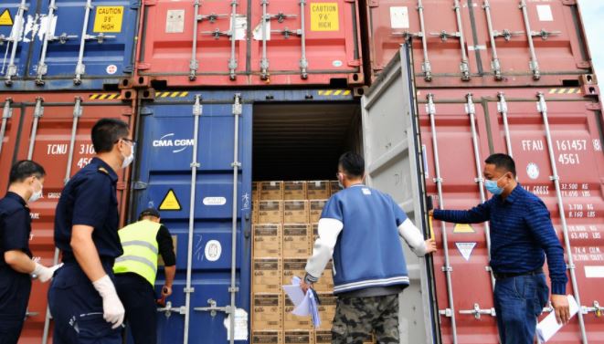Staff members check the cargo bound for Hamburg of Germany at a cargo distribution centre in Haicang District of Xiamen, southeast China's Fujian Province, Nov. 13, 2020. (Xinhua/Wei Peiquan)