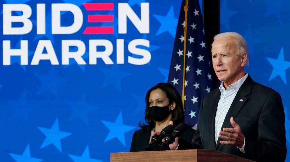FILE PHOTO: Projected winner of the U.S. Presidential election Joe Biden speaks as his vice presidential nominee Kamala Harris listens at The Queen theater in Wilmington, Delaware, November 5, 2020. /Getty