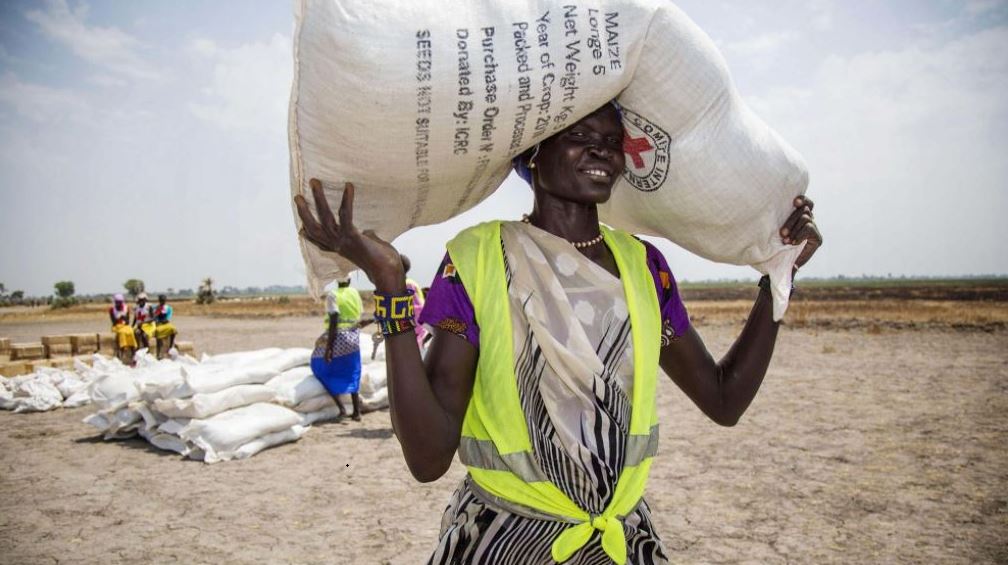 FILE PHOTO: A local community volunteer carries a sack of seeds distributed by the International Committee of the Red Cross (ICRC) in the opposition controlled town of Thonyor, in Leer county, South Sudan on April 11, 2017. /VCG Photo