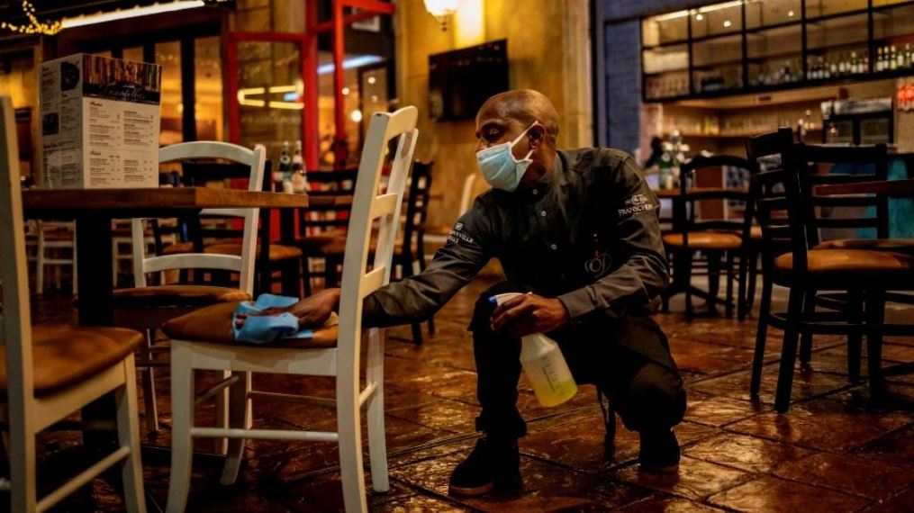 File Photo: A waiter sanitizes a chair in a restaurant at the Montecasino complex in Johannesburg, July 3, 2020. /AFP