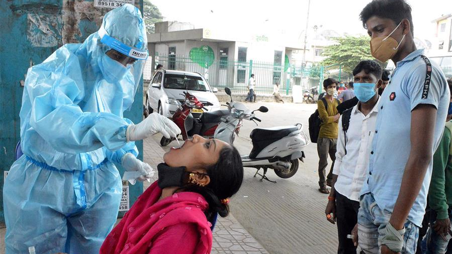 FILE PHOTO: Health workers in India taking samples from a lady during coronavirus testing exercise. /Xinhua