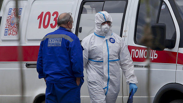 Patients suspected of the coronavirus (COVID-19) infection are being brought to Kommunarka Hospital with an ambulance accompanied by health officials wearing protective suits in Moscow, Russia on May 7, 2020./Getty Images