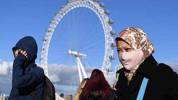 A woman wearing a face mask walks across Westminster Bridge, near the London Eye landmark in central London on March 2, 2020./AFP