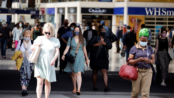 Commuters wearing face coverings due to Covid-19 walk through Victoria station in central London on June 7, 2021. (Photo by TOLGA AKMEN/AFP via Getty Images)