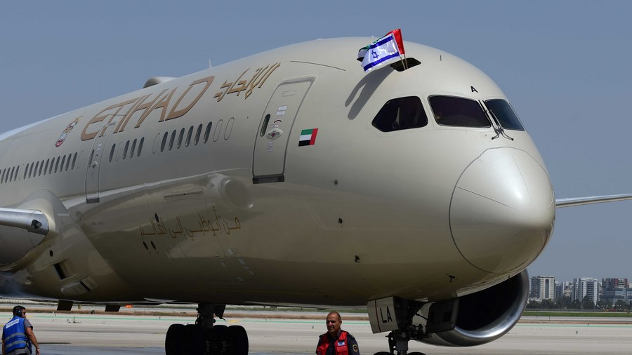 An Etihad Airways aircraft lands at Israel's Ben Gurion Airport near Tel Aviv on the company's first scheduled commercial flight from Abu Dhabi, the United Arab Emirates (UAE), on April 6, 2021. /Xinhua