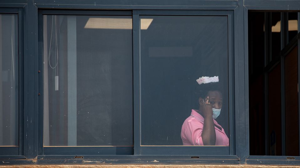 FILE PHOTO: A healthcare worker looks on from a window of the Mulago Hospital during the national anthem on March 10, 2021 in Kampala, Uganda. /Getty Images