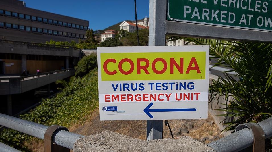 A coronavirus testing unit sign outside Groote Schuur hospital in Cape Town, South Africa. /Getty Images