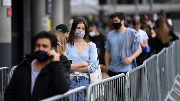 Members of the public queue to receive a dose of a Covid-19 vaccine outside a temporary vaccination centre set up a the Emirates Stadium, home to Arsenal football./Getty Images