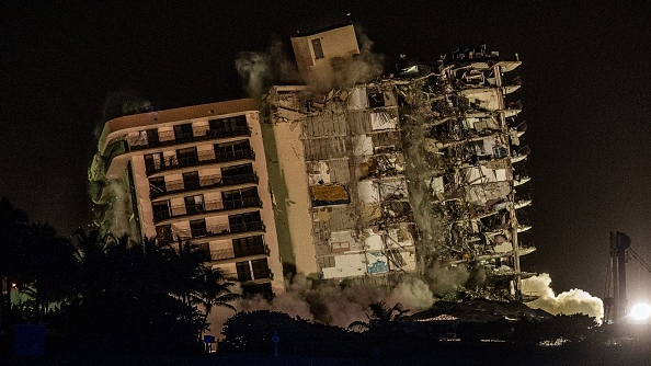 The rest of the Champlain South tower is demolished with a controlled explosion in Surfside, Florida, north of Miami Beach, late on July 4, 2021. - (Photo by GIORGIO VIERA/AFP via Getty Images)