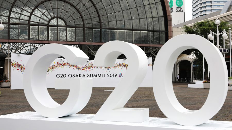 FILE PIC: Photo taken on June 27, 2019 shows a logo of the Group of 20 (G20) summit at the entrance of the media center in Osaka, Japan. /Xinhua