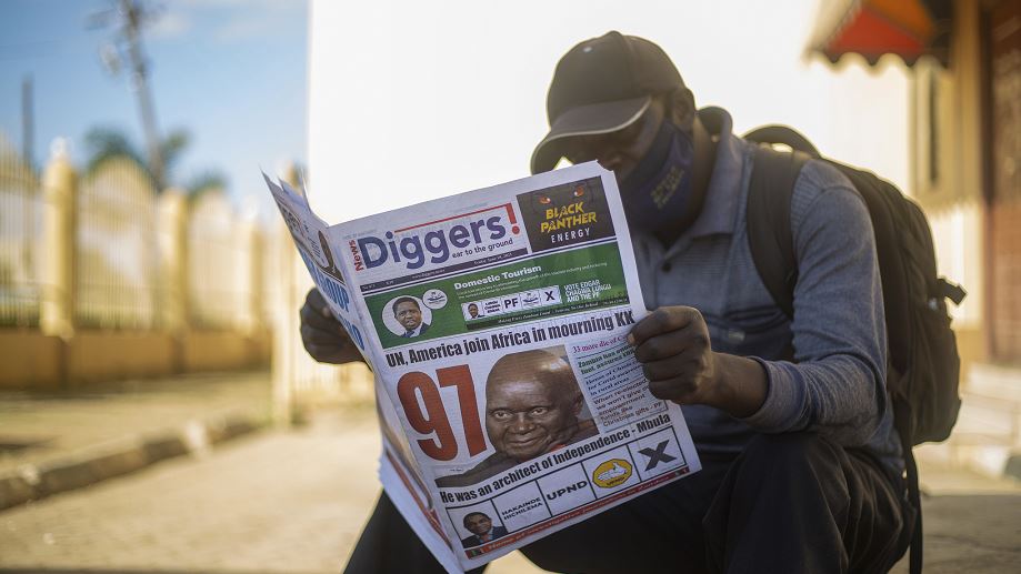 A man wears a mask as he reads a newspaper front page in Lusaka, Zambia, Friday, June 18, 2021. /VCG Photo