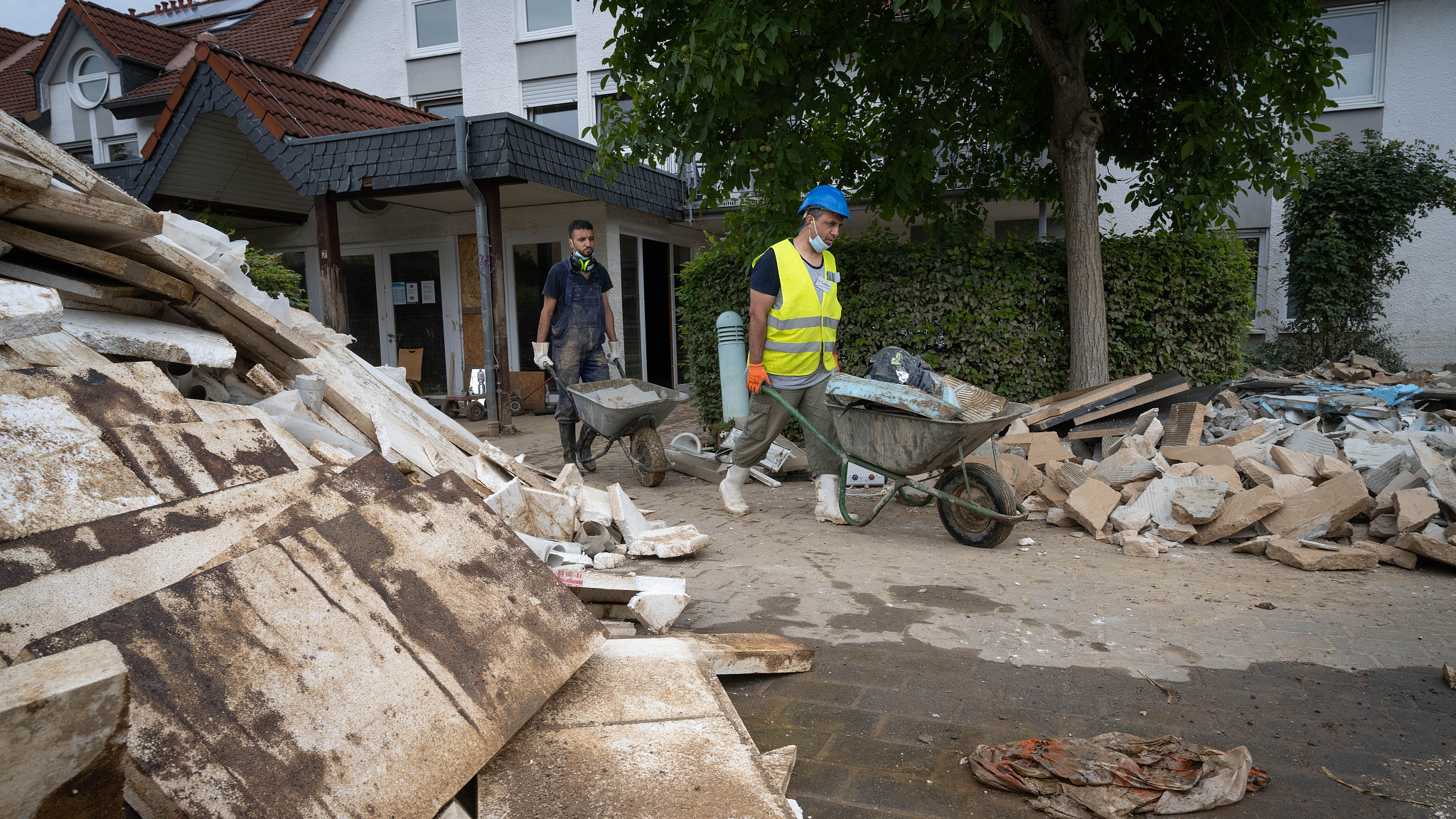 FILE PHOTO: A volunteer of the Syrian refugee volunteer group 'Syrische Freiwilliger Hilfer' clears away debris from damaged buildings caused by the recent flooding in western Germany in Sinzig, Germany. /VCG