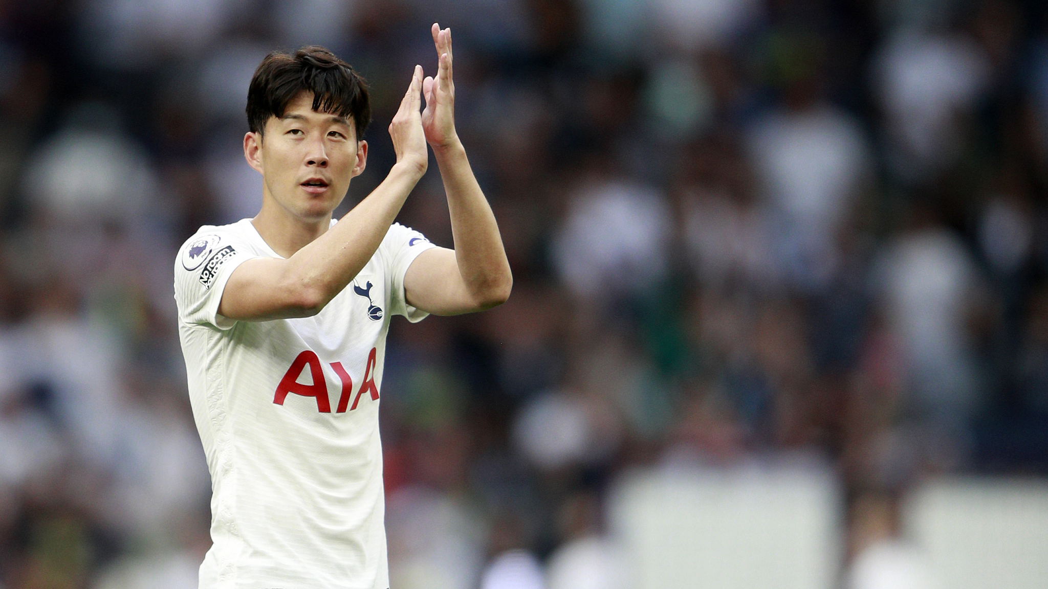 Tottenham's Son Heung-min applauds to supporters at the end of the English Premier League soccer match between Tottenham Hotspur and Manchester City at the Tottenham Hotspur Stadium in London /VCG