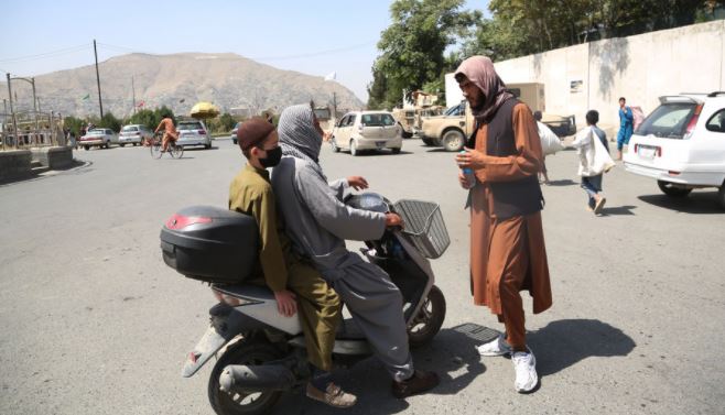 An Afghan Taliban fighter talks with a man in Kabul, capital of Afghanistan, Aug. 16, 2021.(Str/Xinhua)