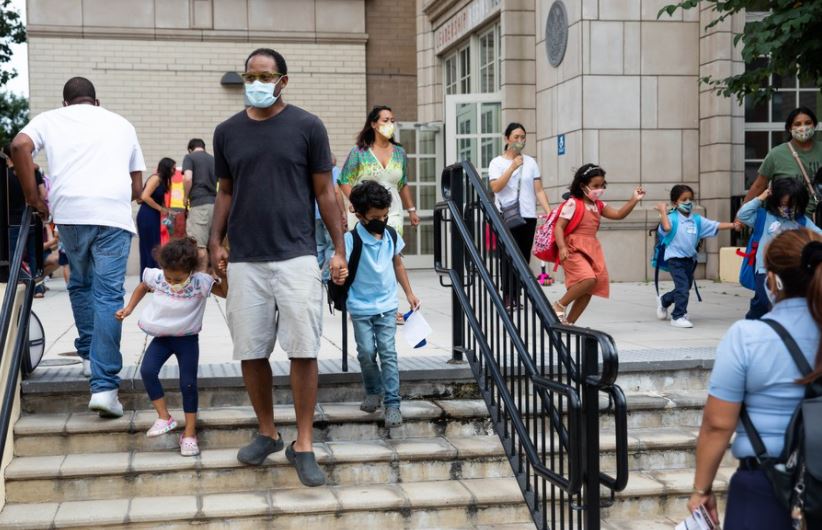 Students are dismissed from the first day of school at PS 133 in the Brooklyn borough of New York, the United States, on Sept. 13, 2021. /Xinhua